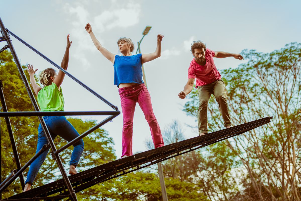 Mão es una intervención urbana sobre la construcción y mano de obra, en la que se erige una estructura de hierro y madera de ocho metros de altura mediante coreografías acrobáticas, giros y gestos cotidianos propios del acto de construir.