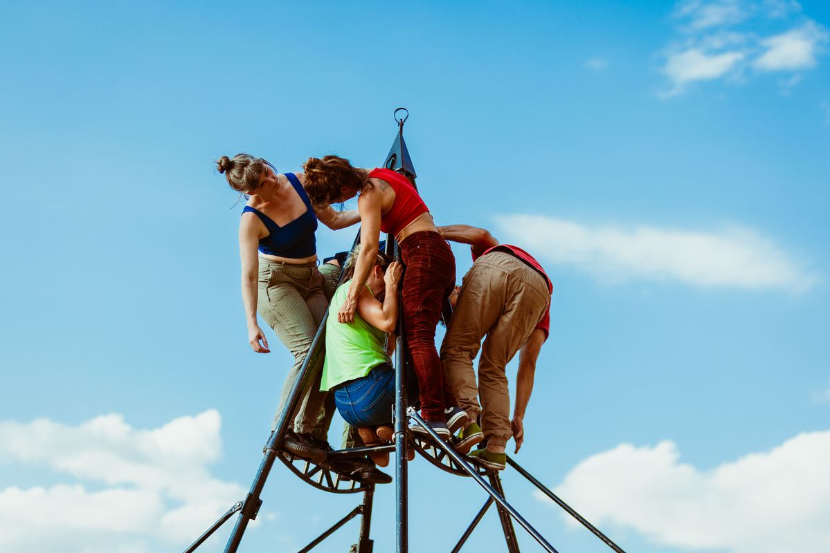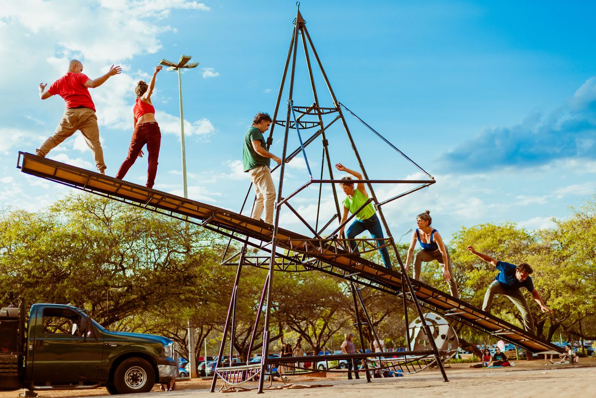 Durante la performance, se crea pieza por pieza en una coreografía que altera la noción del tiempo del espectador. Una obra manual se alza ante el público, entre ideas concretas y metáforas, realizada por hombres y mujeres, que genera expectativas ante el riesgo, el logro y la posible caída humana.