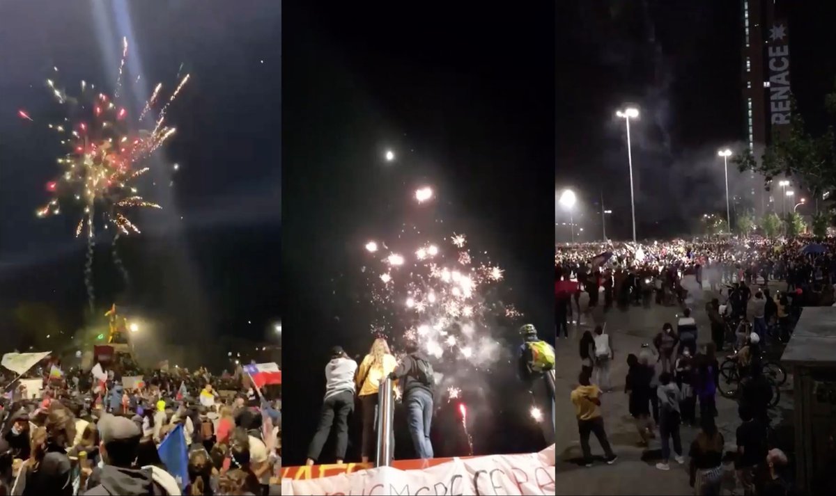 Lo vi después cuando me llegaron todos los videos y dije: "Bueno, pero cómo cerramos esto", y también eso dependía de si ganaba o no el Apruebo, porque si llegaba a ganar el rechazo no iba a haber carrete en Plaza Dignidad. Cuando ya se supo que ganó empecé a fijarme en Instagram quiénes estaban allá y les empecé a mandar mensajes: "Hola, cuando puedas mándame esto", y ahí me empezaron a llegar, entonces fue más que nada para tenerlo, y después ya en el proceso de montaje fue cuando llegamos a la conclusión de que había que hace una línea temporal del día, por eso el primer plano es de alguien que da la impresión de estar despertándose, hasta el final del día con la gente celebrando en la plaza.