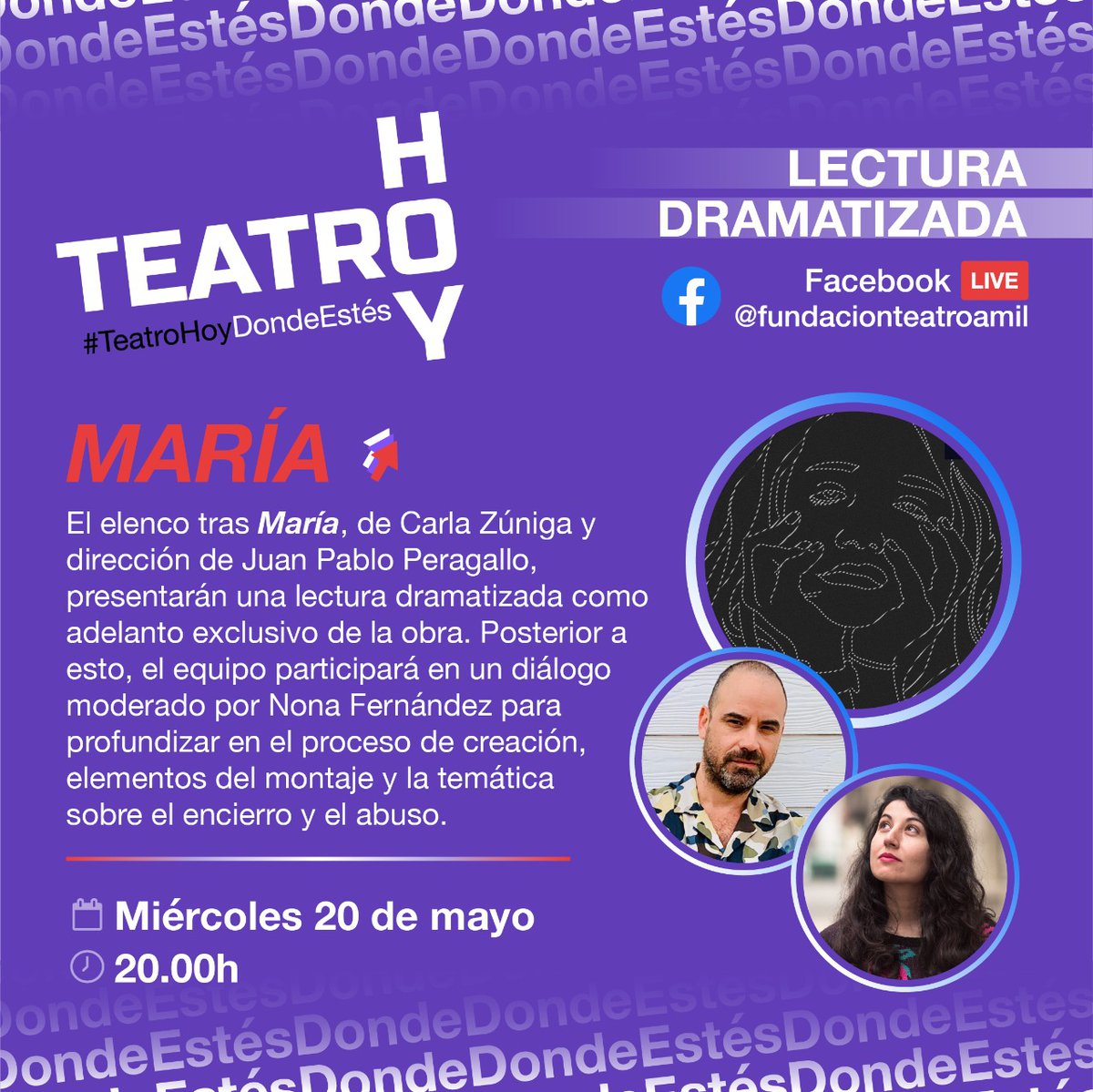 A través de la cuenta de Facebook de Fundación Teatro a Mil, este miércoles 20 de mayo a las 20:00 horas, el público podrá disfrutar de un extracto de la obra María, último trabajo del director Juan Pablo Peragallo (El corazón del gigante egoísta, Ayudándole a sentir), que originalmente se iba a estrenar en la versión presencial del Ciclo Teatro Hoy. Se trata de un adelanto exclusivo de este montaje que finalizará con un diálogo moderado por la escritora Nona Fernández, quien conversará junto al equipo de artistas de la obra acerca del proceso de creación, montaje y las distintas temáticas que aborda.