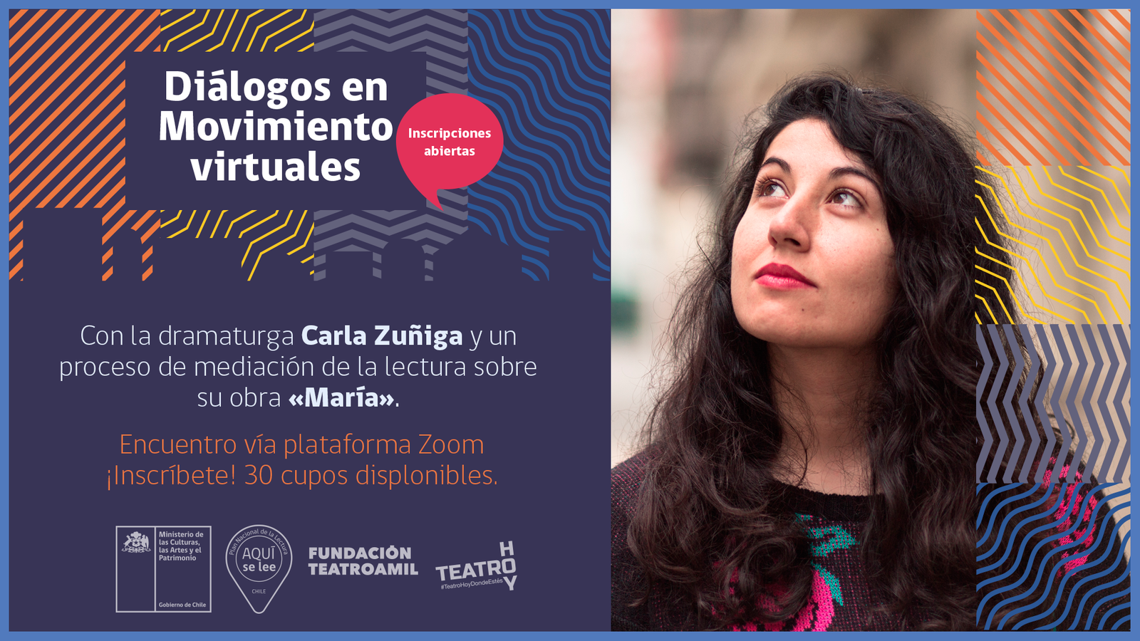 Este lunes 18 de mayo será el primer diálogo con la dramaturga Carla Zúñiga sobre la obra María. La actividad está dirigida a público general y los primeros 30 inscritos podrán participar de sesiones cerradas por zoom. Estas sesiones serán publicadas en Facebook para quienes quieran seguirlas en vivo.