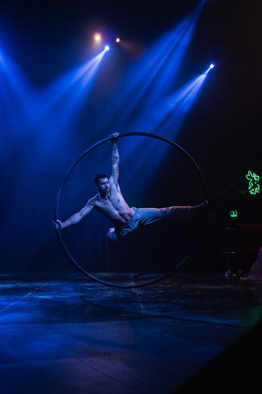 Desarrolla el circo contemporáneo como eje de creación y puesta en escena: danza contemporánea, teatro físico, composición musical y audiovisuales.