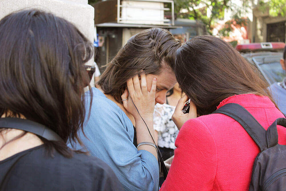 Las instrucciones eran claras: pararse en un lugar, ponerse los audífonos, abrir AppRecuerdos y subir el volumen. Hasta que la voz de una mujer comenzó a escucharse. Cristóbal se titulaba el primer audio que se ubicaba a un costado de la pileta de Plaza de Armas, el cual nos narraba la historia de un niño que no sabía que su padre era detenido desaparecido y deseaba volver a reunirse con él. Durante un poco más de cuatro minutos, miro alrededor y el entorno luce caras de concentración, de angustia, de conmoción, de tristeza. “Apela mucho a la intimidad, porque te comparten cosas de su memoria y a través de los audífonos. Hay un vínculo pequeño, pero de gran acceso”, dirá más tarde Javiera, bailarina de 25 años que utiliza esta experiencia como parte de la creación del proyecto El cuerpo de la letra, de Verónica Troncoso y Pamela Mellado.