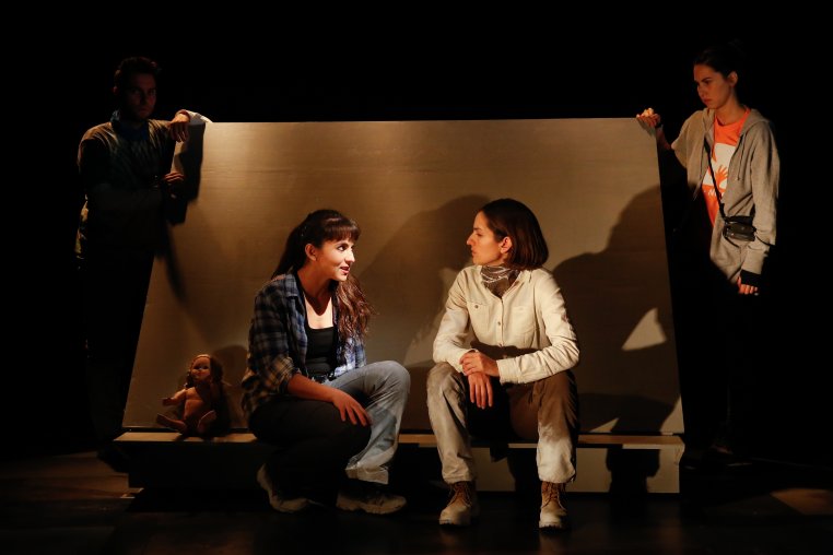 Por otro lado, la utilización de proyecciones audiovisuales con el fin de construir el contexto en el que se encuentra la historia no alcanza a lograr su cometido, pues no desemboca en nada concreto a lo largo de la obra que justifique su utilización. Hubiese sido deseable un trabajo más acabado desde el diseño escenográfico para sugerir un entorno de destrucción masiva posterior a un terremoto. En este sentido, lo único que vemos es un escenario repleto de objetos cuya relevancia en la acción dramática es casi nula, pues ésta podría llevarse a cabo sin ellos, ya que es el texto el dispositivo que más se utiliza para construir aquello que no vemos.