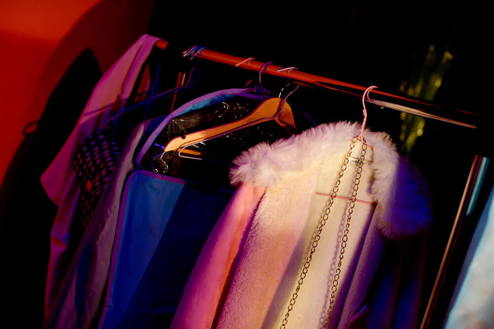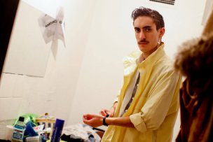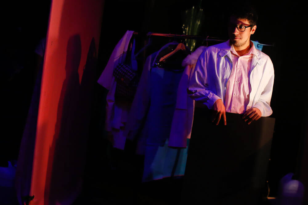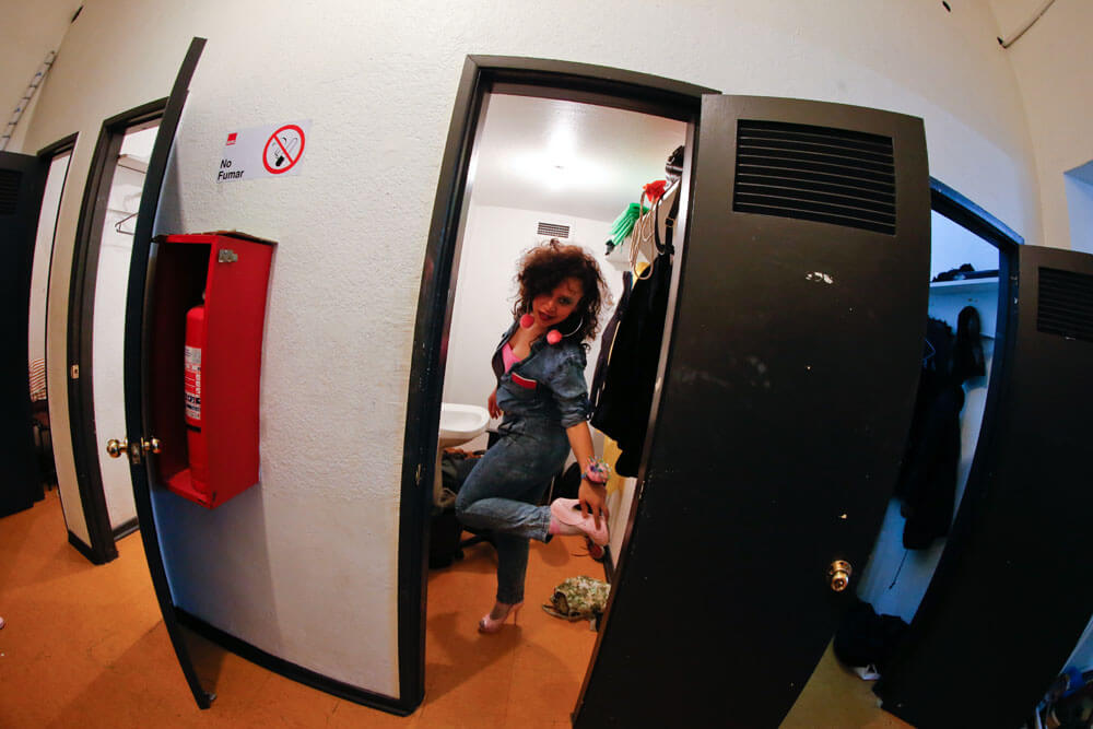 Más de una docena de empinados escalones separan el escenario de los camerinos. En el subterráneo, aproximadamente 30 piezas de vestuario –cada actor se cambia tres veces en toda la obra– cuelgan a lo largo de un frío pasillo que luce tres camarines y dos baños. Entre pantalones, chaquetas, vestidos de color pastel, y otros atuendos típicos de la década del 80; una de las integrantes de la compañía revisa cajas llenas de materiales. Mientras, algunas de las actrices terminan de retocar su maquillaje y peinado, y conversan sobre la obra con un marcado acento español. No es sorpresa, ya que cada uno de los protagonistas interpreta a un integrante de una compañía cinematográfica española.