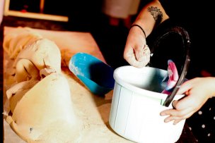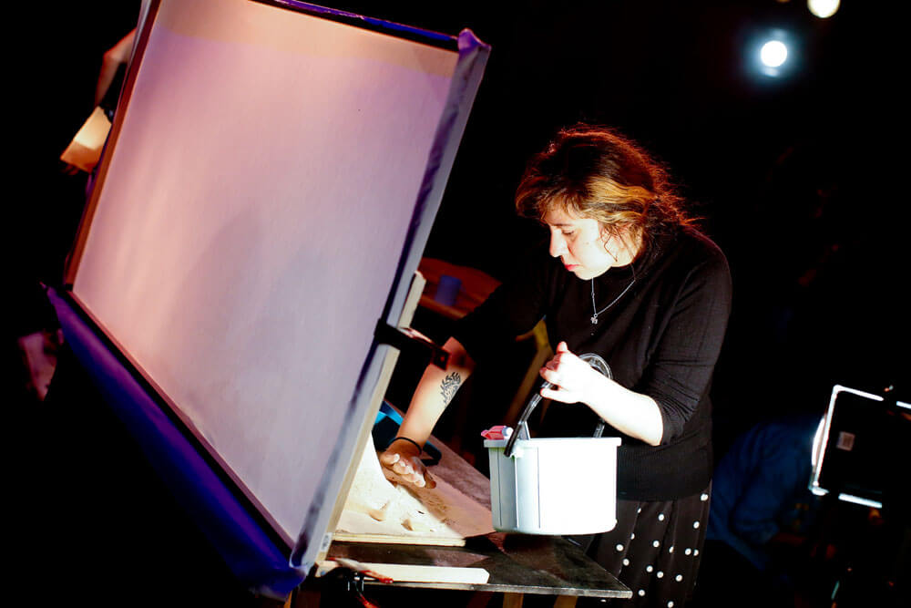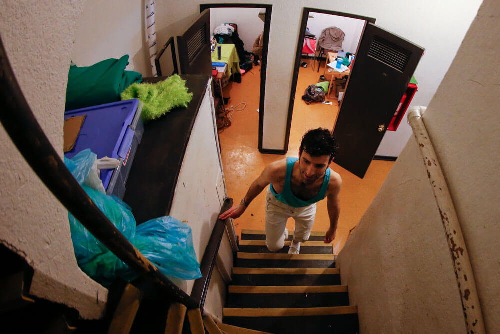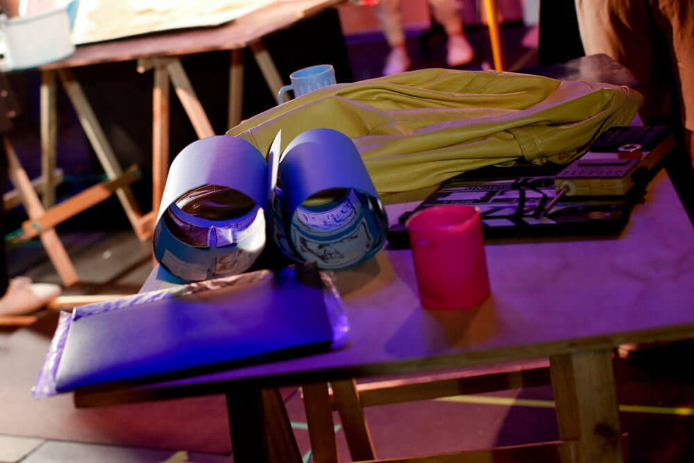 Cuidando no aplastar nada en el suelo, y esquivando mesas llenas de accesorios y elementos que serán utilizados en el montaje; David –con acento español– pregunta si está todo listo, si el elenco está listo. A menos de cuatro horas del horario de función, todo el equipo se reúne detrás de un panel que más tarde servirá para una escena que incluye sombras chinas. Allí, y rodeado de una media luna de compañeros, el director invita a la calma: “Pásenlo bien, chiquillos. Y tranquilos, ahí vamos viendo cómo resulta todo”.