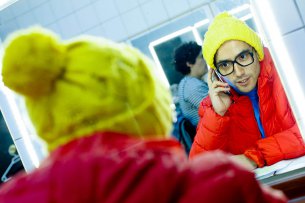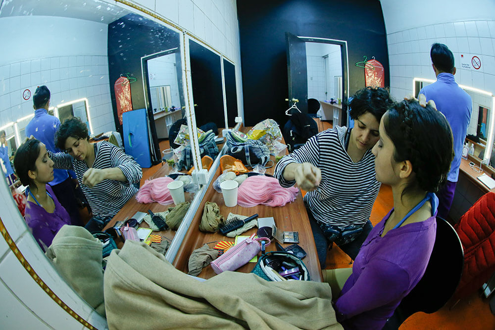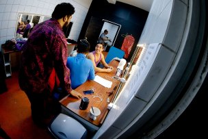 Además del vestuario repartido por la parte posterior del escenario, está lo que cada uno de los actores ya tiene puesto cuando aún resta media hora para el estreno. Colores amarillos, celestes, morados, rojos y cafés se funden en el camarín donde los intérpretes se pasean de un lado para otro, pero donde hay más risas y tranquilidad que en la sala.