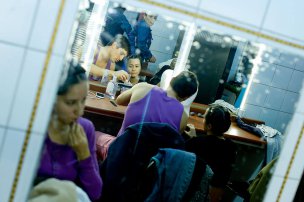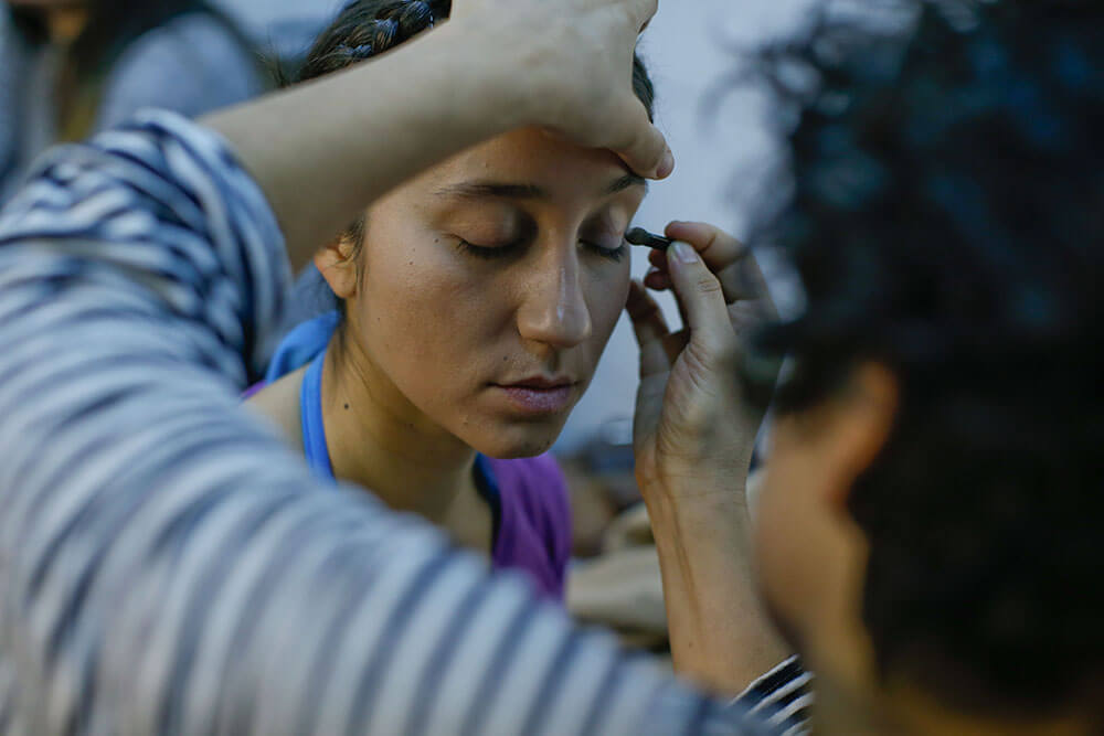 Uno de los más risueños es Jaime Leiva, el encargado de dar vida a Sócrates, el protagonista de la historia. ¿Cuál es su secreto? “Me vengo caminando. Siempre camino por lo menos media hora antes de cada función”, explica sonriente mientras dos de sus compañeras se maquillan, y otro se peina una y otra vez con gel. “Me ayuda a soltarme y llego más preparado. Lo que hago es venirme en metro y me bajo en alguna estación anterior, como Santa Ana, por ejemplo, y de ahí me vengo tranquilo hacia el teatro”.