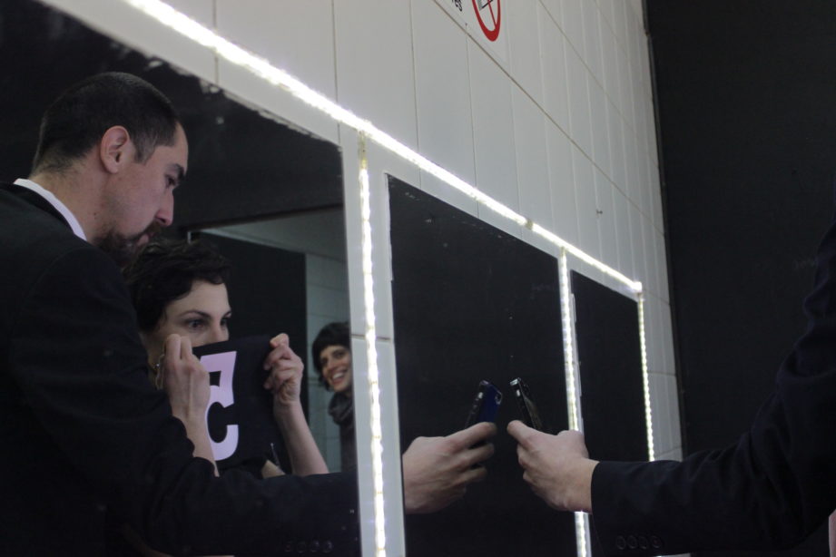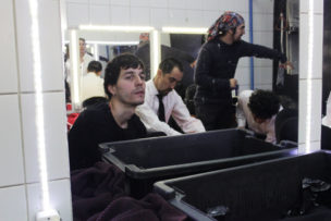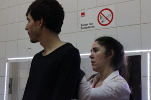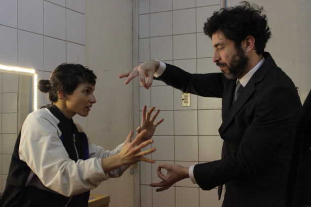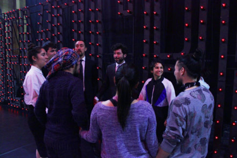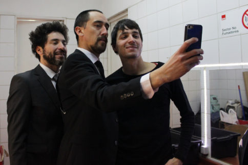 Llegó la hora del clásico “mierda, mierda” entonces llaman a todas las personas que están trabajando para la obra, entre ellos Daniel Recabarren, asistente de dirección. Las personas encargados de los aspectos técnicos y el elenco se toman de las manos. Moisés dirige las palabras, agradecen a todos por su trabajo, recuerdan al director brasileño Felipe Hirsch, tiran un par de bromas más y lanzan el grito MIERDA MIERDA. Es el momento de los abrazos y retirarse del escenario. La función está por comenzar.