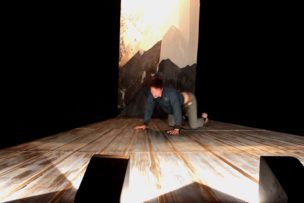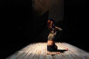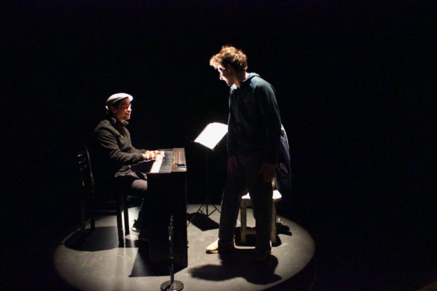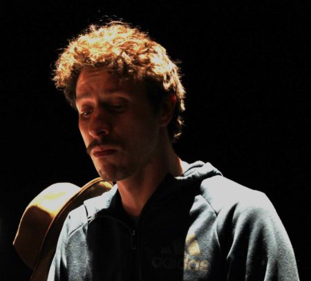 Llego a la sala, está Nicolás Pavez y Nicolás Lascar, encargado de la composición e interpretación musical, ambos ensayan y hacen ejercicios de calentamiento. En la sala hay completo ambiente de concentración. Mientras Pavez y Lascar calientan, los técnicos prueban las luces y el sonido. Pareciera que al protagonista nada lo desconcentra de sus tareas, está entregado al personaje. Comenta que está un poco ronco. Recitar en décimas por 55 minutos no debe ser nada sencillo, interpretar diversos personajes tampoco, pienso. Lo vemos elongar y vocalizar varias veces, en conjunto con su compañero recrean pequeños fragmentos de la obra, calientan sus voces y llega la directora, Soledad Cruz, quien estuvo al menos una hora en un taco, pero está lista para que comience la función. Ya es hora de ir al camarín.