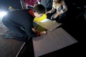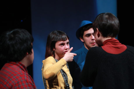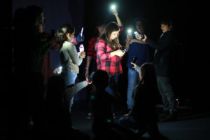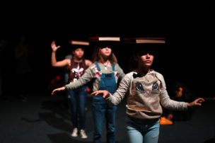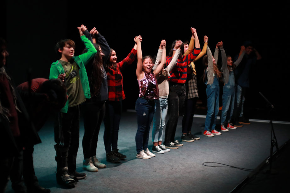 Los intérpretes cargan sus teléfonos. Una vez con la batería al 100% se conectan a la aplicación creada específicamente para este montaje, y vemos sus caritas en modo selfie proyectadas. Es como si estuvieran transmitiendo en vivo en sus historias de Instagram, pienso. Están repasando y viendo los últimos ajustes antes de comenzar el ensayo de corrido, revisan sus diálogos y se corrigen unos a otros, de manera amistosa y colaborativa. María José Contreras y Trinidad Piriz se ven felices, están más nerviosas que los niños. Se acercan a ellos y les dan las últimas indicaciones. Preguntan ¿Se sienten preparados para hacer una pasada con público? y responden en masa: NOOOO! entre un alboroto de risas jocosas, con el único fin de bromear a las directoras.