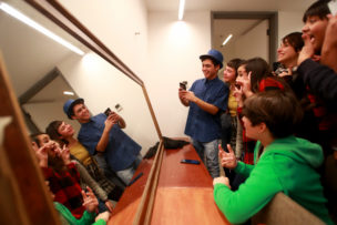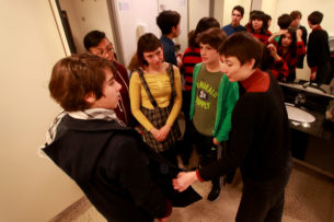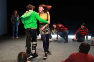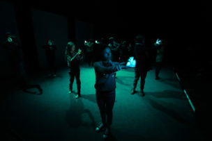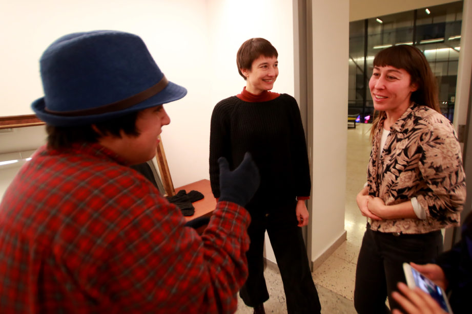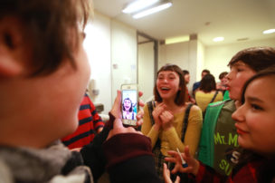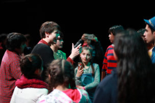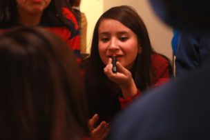 Terminan de ensayar esta escena y ya es hora de vaciar la sala para que empiecen a entrar sus familias, invitadas a presenciar este a obra en la que vienen trabajando desde enero. Nos vamos a los camarines. Es difícil entender sus conversaciones, están todos gritando y a ratos escucho parte de los diálogos de la obra. Unos ensayan en el espejo, otros se maquillan. Por otra parte tenemos a los que prefieren concentrarse alejados del tumulto, pero son los menos. “Estoy segura que se me va a olvidar lo del BIG DATA, EL BIG DATA” dice una chica, todos se ríen, hablan del nuevo algoritmo de Facebook, hacen historias para sus propias redes sociales y la mayor parte del tiempo se ríen. A ratos entra Trinidad o María José para decir algunas palabras, los jóvenes quieren hacer un clásico “mierda mierda” pero como son menores le llaman “zuki zuki”.