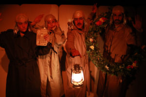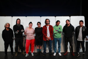 Comienzan a probar diferentes escenas. Vemos distintas composiciones en las que cambian de vestuario y juegan con la iluminación. El director va corrigiendo algunas cosas, sugiere entonaciones, posturas, actitudes y anima al equipo. Los intérpretes, en la voz de los cuatro vocales de mesa, reflexionan en torno a la temática de la democracia; juegan con el concepto y lo recorren en su amplio espectro. Me sorprende la ironía con la que se exponen en su propio quehacer cuestionando su lugar en el “teatro político” de hoy. Son ágiles en sus movimientos y en la interpretación, hay juegos de palabras que son cómicos y a ratos olvido la densidad del tema. Telas sobre sus cuerpos, diálogos con ritmo y constantes interpelaciones entre los personajes, es la imagen final que nos permite ver el director. En estos pocos minutos, ya se logra vislumbrar que la obra dejará varias interrogantes. Una de ellas y la más directa, sin duda, será la frase que llevan estampadas en unas de sus ropas de cambio: “El futuro no será una fiesta”.