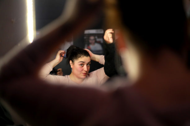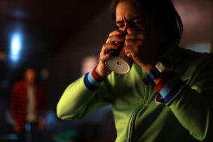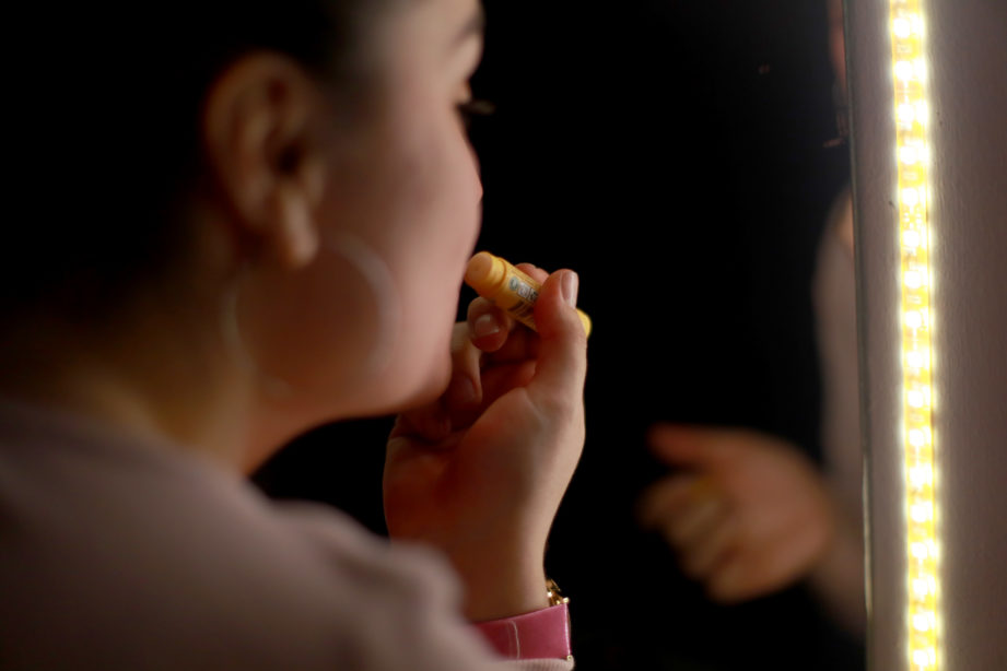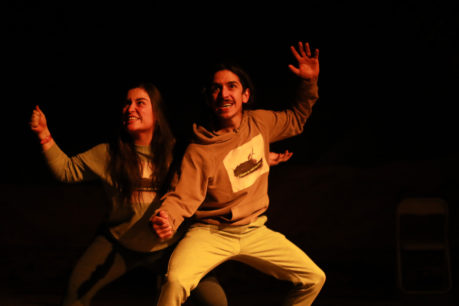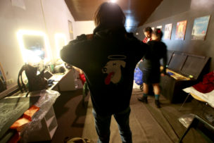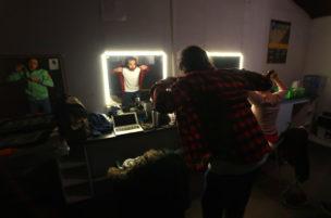 Ya en la sala, veo de inmediato al director de la obra, Sebastián Squella, alistando las luces para comenzar el último ensayo antes del pre-estreno. Todo está dispuesto para que no hayan errores. Los intérpretes se encuentran en los camarines. Hace frío. Victoria Iglesias, actriz y productora de Teatro Perro Muerto, se quita las pantys para sentirse cómoda en escena. Mientras, Rodrigo Florechaes ensaya el texto y Camilo Venegas se prepara un té, para luego ponerse el característico polerón de la compañía. Valeria por su parte, deja entre ver un poco de nerviosismo y nos cuenta que están ansiosos por mostrar el trabajo. Comienzan a entrar en sus personajes: parten con el vestuario -prendas muy cotidianas- y terminan con un maquillaje simple, que hace que todo el elenco se vea muy natural y realista. Bajamos por la estrecha escalera a la sala, todo está dispuesto y el director continúa afinando los detalles de las luces y microfonía.