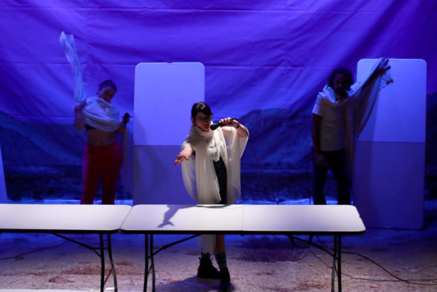 Comienzan a probar diferentes escenas. Vemos distintas composiciones en las que cambian de vestuario y juegan con la iluminación. El director va corrigiendo algunas cosas, sugiere entonaciones, posturas, actitudes y anima al equipo. Los intérpretes, en la voz de los cuatro vocales de mesa, reflexionan en torno a la temática de la democracia; juegan con el concepto y lo recorren en su amplio espectro. Me sorprende la ironía con la que se exponen en su propio quehacer cuestionando su lugar en el “teatro político” de hoy. Son ágiles en sus movimientos y en la interpretación, hay juegos de palabras que son cómicos y a ratos olvido la densidad del tema. Telas sobre sus cuerpos, diálogos con ritmo y constantes interpelaciones entre los personajes, es la imagen final que nos permite ver el director. En estos pocos minutos, ya se logra vislumbrar que la obra dejará varias interrogantes. Una de ellas y la más directa, sin duda, será la frase que llevan estampadas en unas de sus ropas de cambio: “El futuro no será una fiesta”.