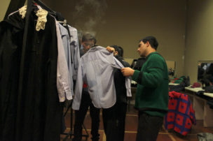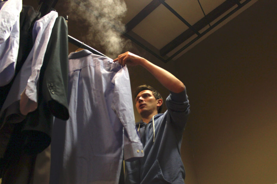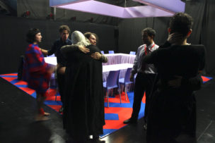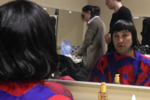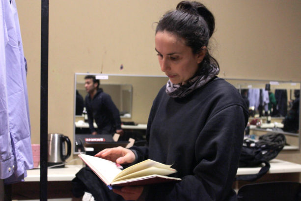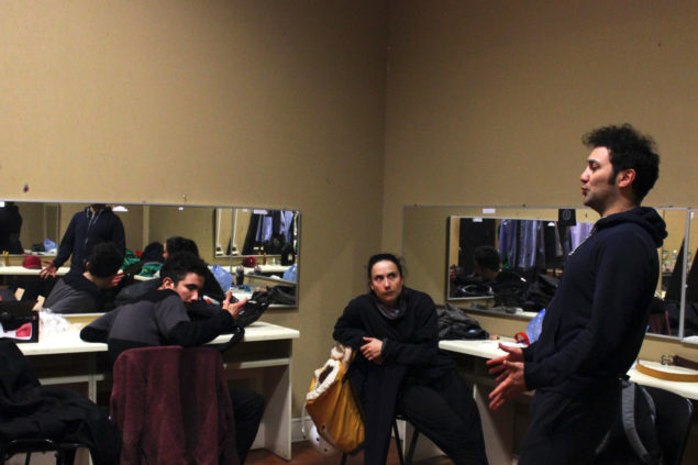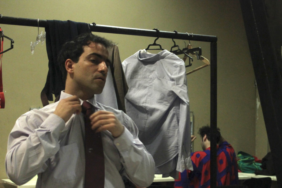 De a poco comienzan a llegar los intérpretes. Entra a la sala Gabriel Cañas, nos saluda y sube la escalera cantando lo más fuerte posible. Yo lo sigo, y entramos a la sala donde se preparan todos. Algunos hacen ejercicio, otros repasan textos mientras planchan sus vestuarios.