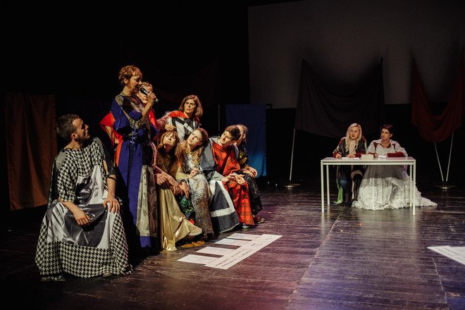 El coro es un recurso recuperado principalmente por Brecht en su etapa más experimental en la que elabora sus “piezas de aprendizaje”. En estos trabajos Brecht renunciaba a trabajar con actores profesionales, y en su lugar ponía a obreros de un sindicato o a estudiantes de un Liceo a decir textos que enunciaban argumentos sobre un determinado dilema. En Oratorium este recurso coral se amplifica al constituir estos dos elencos ciudadanos, el Coro de delegados, quienes trabajaron con SheShePop en el proceso de montaje y varía según la ciudad donde se presenta; luego el propio público que asiste y que cambia de función en función, finalmente los actores de SheShePop que se suman a los demás participantes. Las pantallas cumplen la función de un apuntador permanente, un recordador de lo que hay que decir, pero también de lo que no hay que olvidar. Las pantallas se ubican una frente a la otra, es decir, mientras los espectadores leen desde una, determinadas frases, el coro de delegados lee desde otra, a nuestras espaldas, otros textos. Por intervalos unos u otros quedamos en silencio, unos u otros hablamos, generándose un dialogo que va y viene de las graderías a la escena y viceversa. La lectura se convierte en una ejecución en tiempo presente -en inglés, alemán y francés la palabra juego significa al mismo tiempo ejecutar un instrumento y actuar-un ejercicio vivo con todo lo impredecible, errático o cómico que puede llegar a tener un suceso performativo, pues como somos obligados a leer algo por primera vez, la duda surge continuamente, especialmente cuando no comparto aquello que debo repetir. Una suerte de mecanismo de distanciamiento de nuestras propias posiciones. En definitiva, este gran ejercicio de repetición deviene en un Coro ciudadano en el que logramos la anagnórisis en el acto mismo de la enunciación. Quien habla, quien delega, quien representa. La palabra se desprivatiza no hay espectadores no hay actores lo que hay son preguntas que desnaturalizan nuestro vínculo con la propiedad, con la vergüenza de ser herederos, o con la urgencia de encontrar un departamento donde habitar, al final un refugiado nos habla del absurdo de perderlo todo por la guerra.
