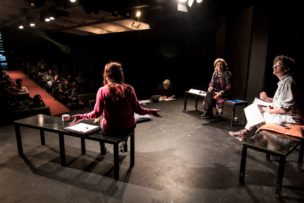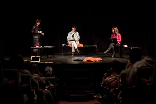 Asistimos a un ensayo abierto en el teatro Ictus, metodología que acuña la compañía desde sus comienzos, y que se repite esta tarde para mostrarnos una escena de lo que será su próximo estreno. El público está compuesto por personas de diferentes edades, estudiantes, periodistas, organizaciones, entre otros. Nos inmiscuimos en el exhaustivo ensayo de la compañía y como es de costumbre, terminado el ensayo podemos sugerir cosas que aporten en su proceso creativo o hacer preguntas, lo que abre un espacio de diálogo horizontal en el que nos enteramos más sobre su trabajo.